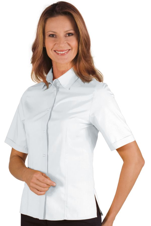 Camicetta Isacco da lavoro per donna. Consigliabile per settori alberghiero, ristorazione, ricevimento, hostess, accoglienza al pubblico. Abbinabile con pantaloni, giacche, grembiuli, cappelli, cravatteria coordinati. senza Tasche, Polsi con 1 Bottone, Colletto Italiano. Chiusura con bottoni classici. Composizione del tessuto 65% Poliestere e 35% Cotone 115 gr/m2.