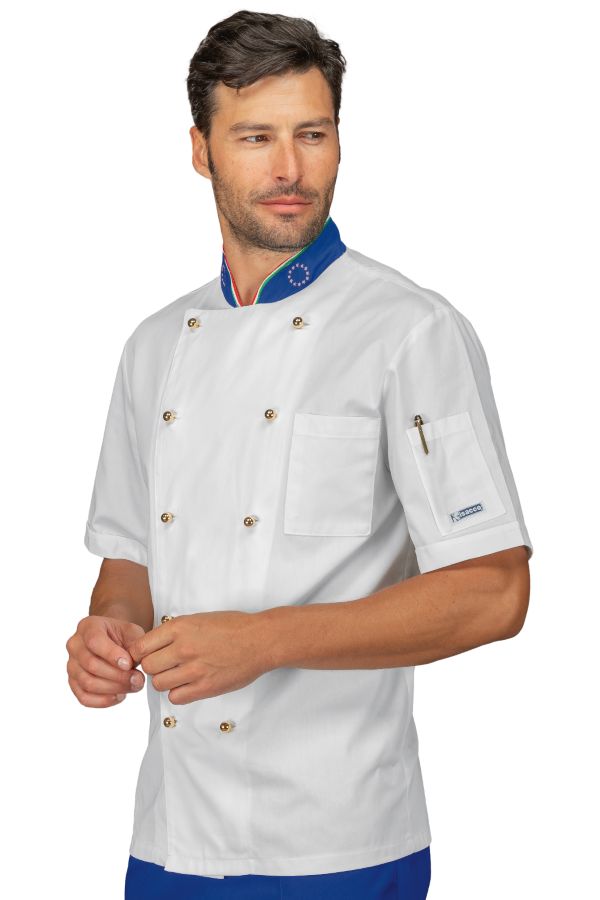 Giacca da Cuoco Isacco. Articolo adatto per settori ristorazione, pasticceria, cucine, gelaterie. Abbinabile con capi coordinati come pantaloni, grembiuli, cappelli, accessori vari. 1 Tasca al Petto e 1 Taschino Portapenna, Polsi con Risvolto, Colletto Coreano. Chiusura con bottoni a pallina antipanico. Composizione del tessuto 65% Poliestere e 35% Cotone 195 gr/m2.